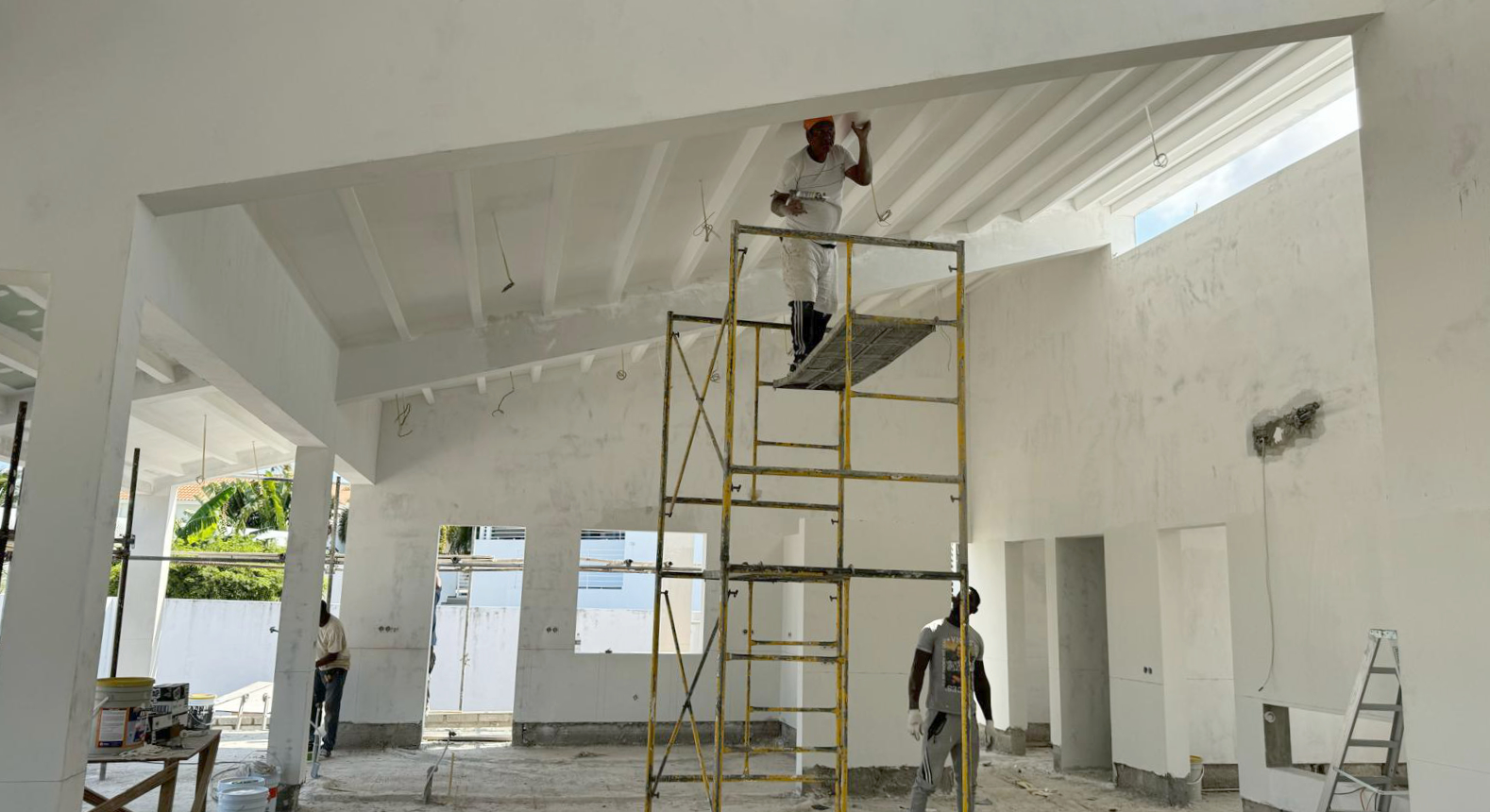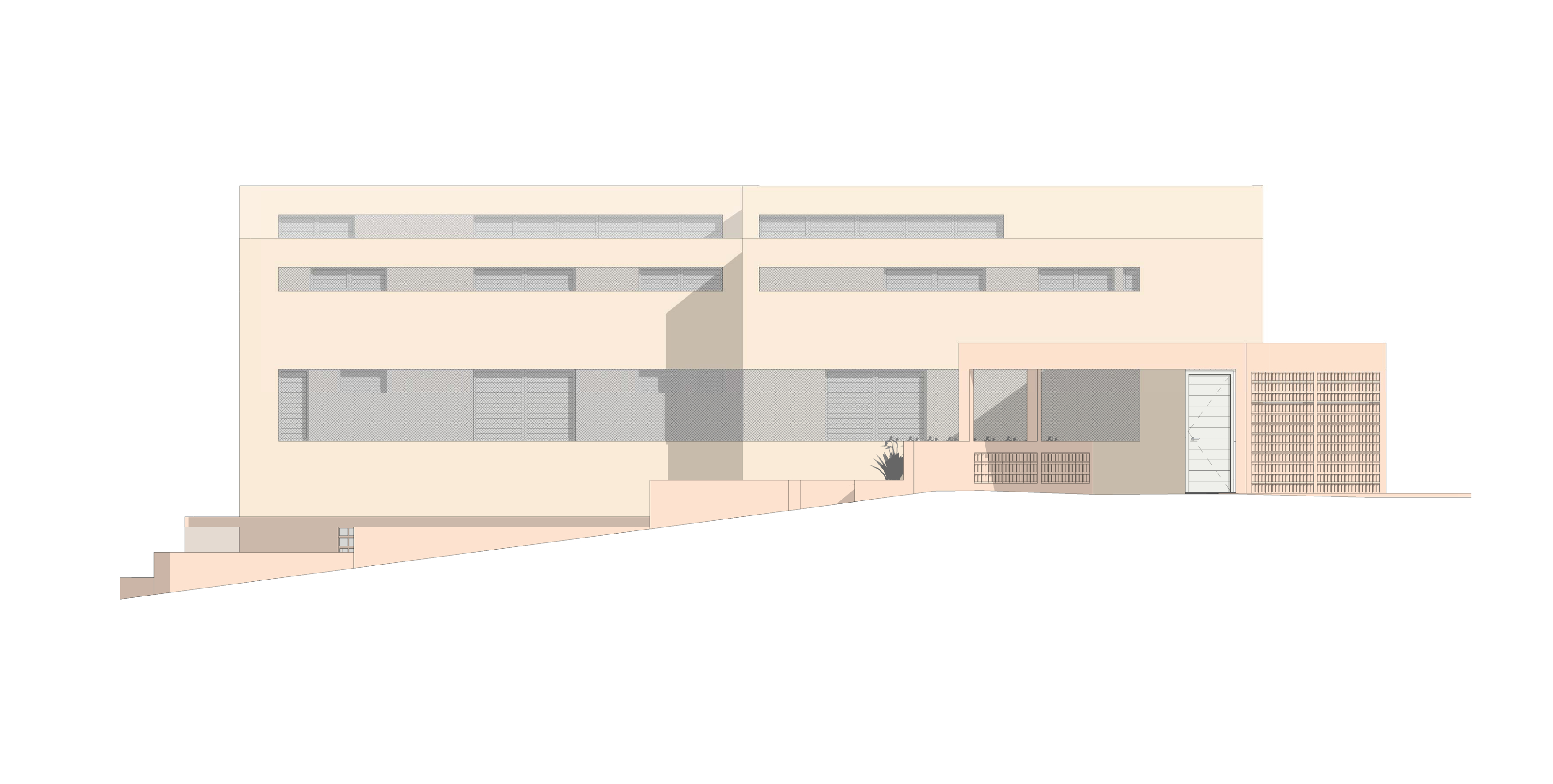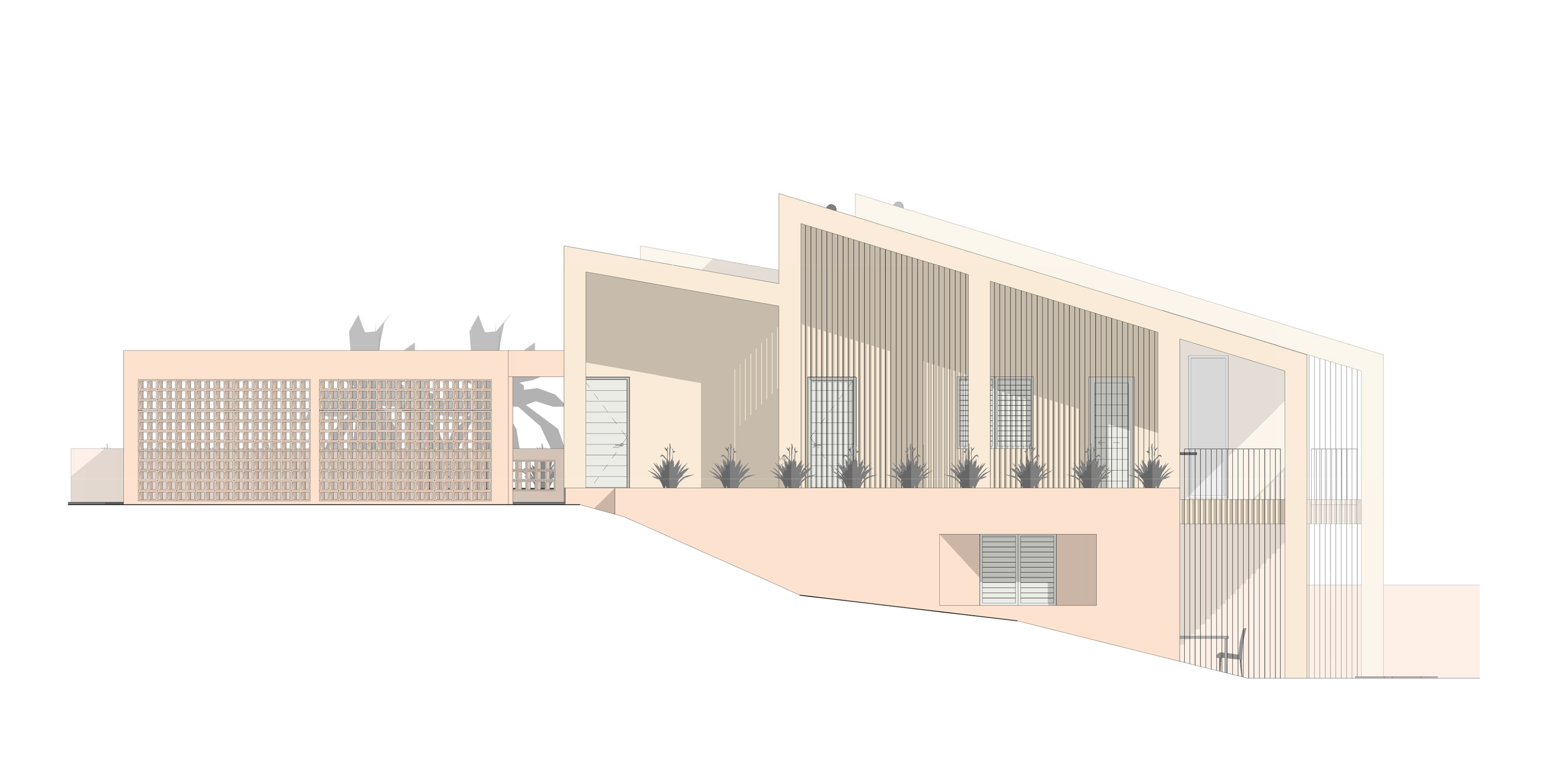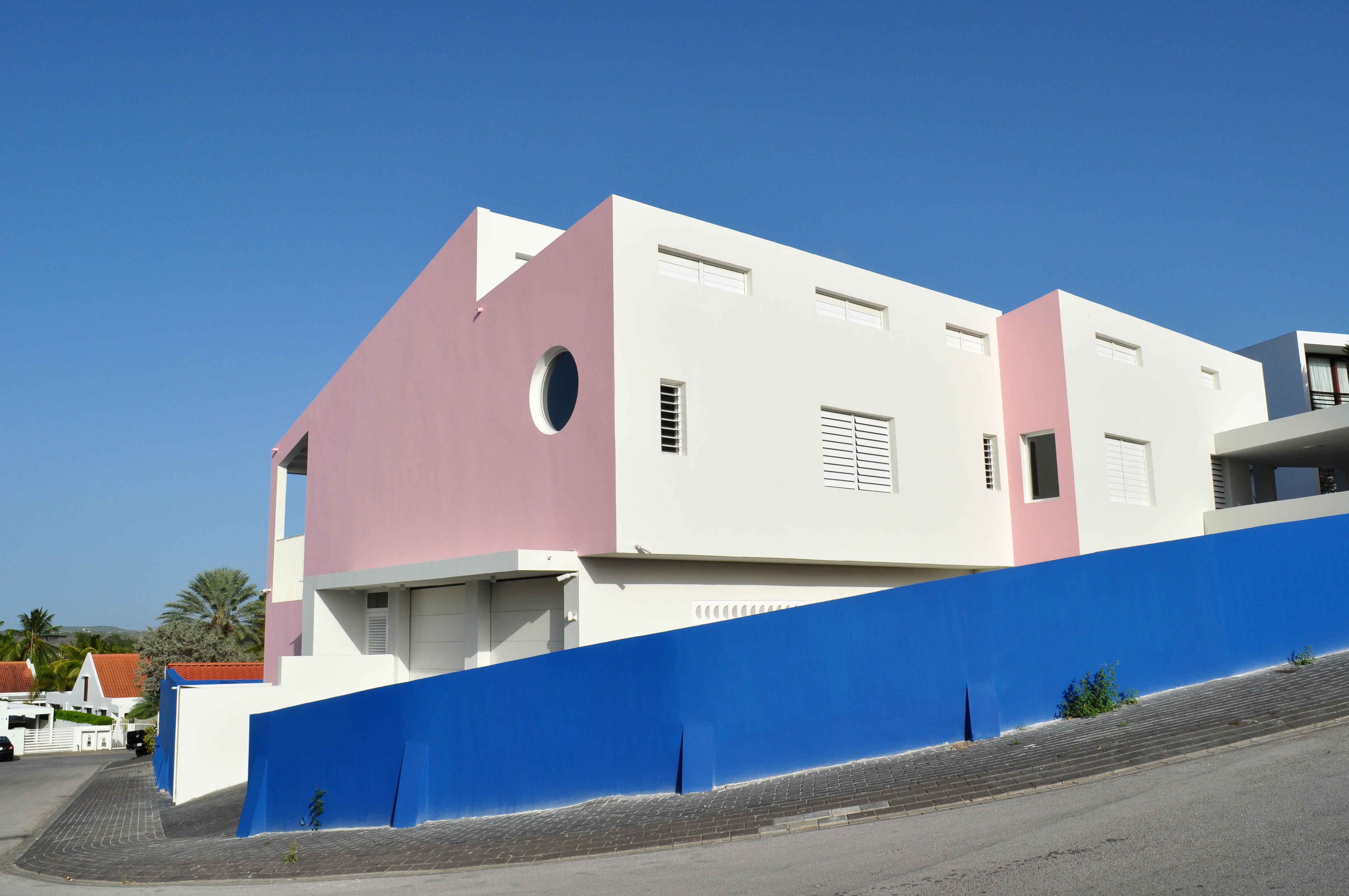 > Ontwerp een huis bestaande uit een hoofdwoning, een gastenverblijf en een garage op een relatief klein stuk land op Curaçao.> Zorg dat alle ruimtes natuurlijk gekoeld kunnen worden door de noordoostpassaat; de wind die daar bijna het hele jaar door waait en zorgt dat het ondanks de hitte aangenaam blijft.